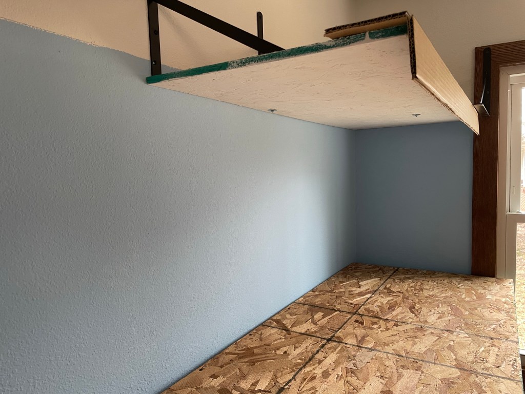 The OSB is painted with two coats of white primer. I did this thinking it would help reflect more light onto the railroad. Looking at the valance in place, I am not happy with the white. The white stands out way too much (for me) against the blue painted backdrop band. When operating, because of my height, I probably wouldn’t notice the white. I’m sure operators shorter than me, would notice the white against the blue. But I think if the OSB was blue, it wouldn’t nearly be as noticeable. So…I’m going to take down the test piece, paint it blue and see how it looks.