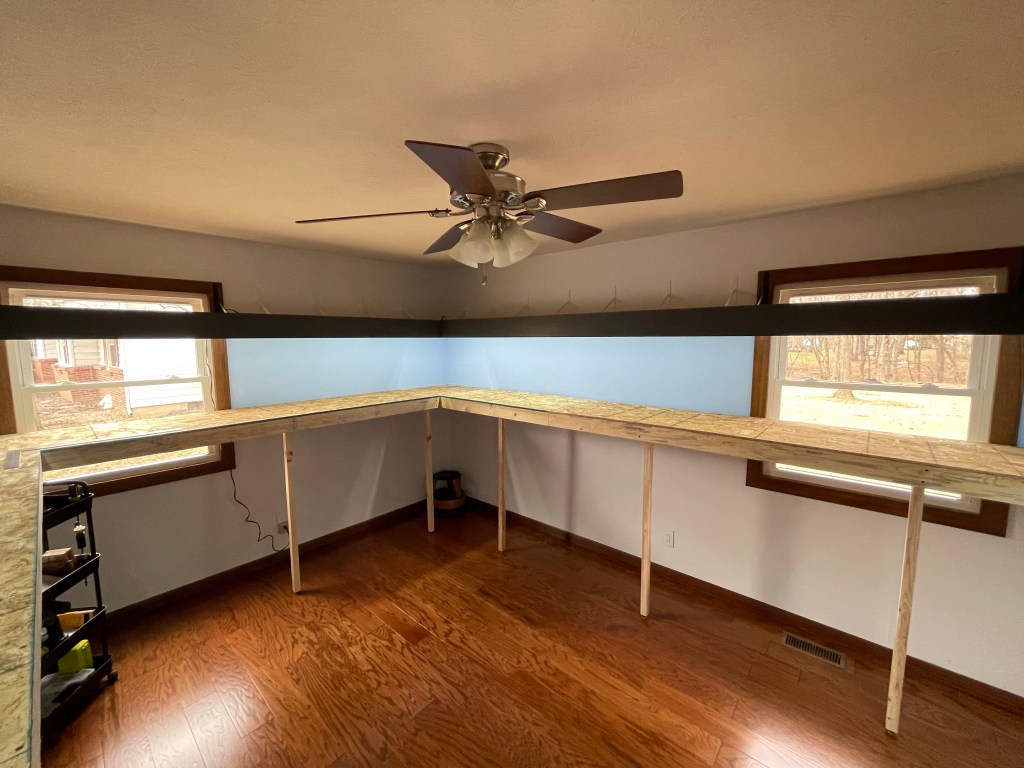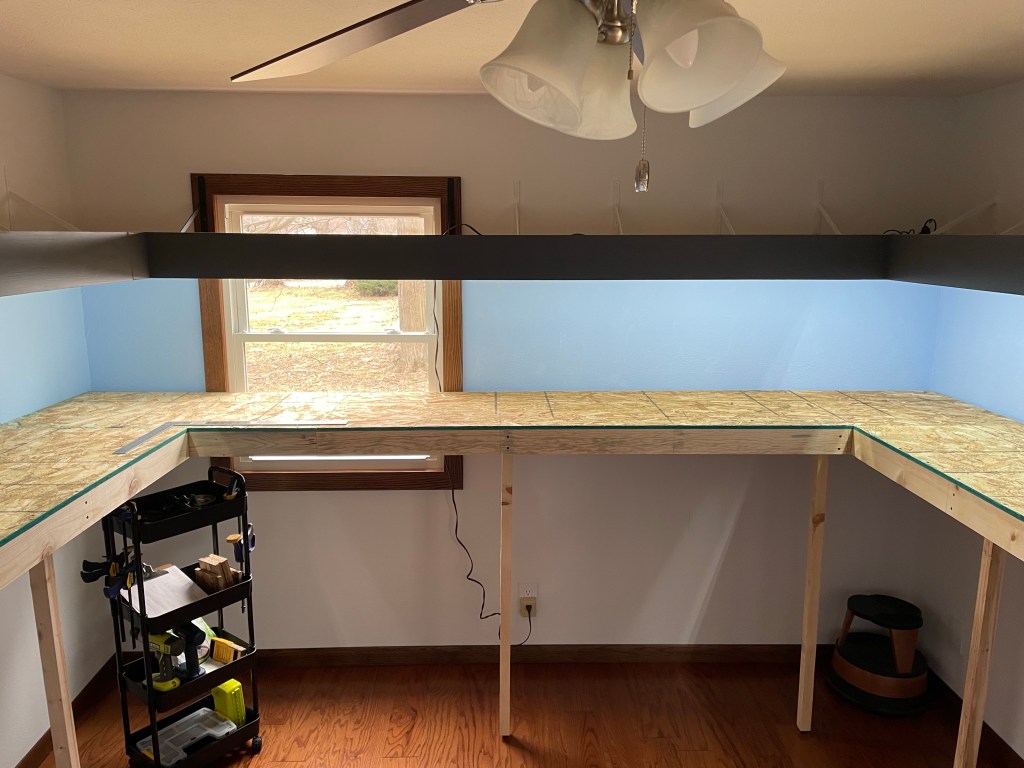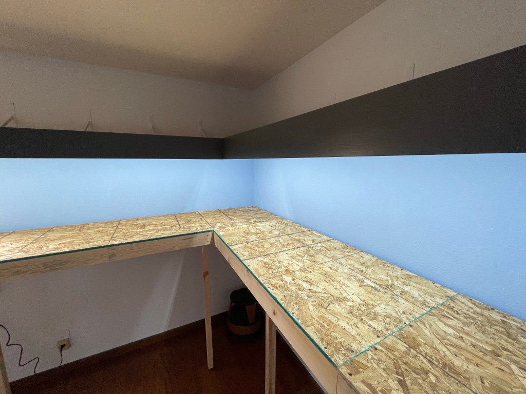 The benchwork you see is all attached to the walls. Because of the window molding, I had to put a 1/2” spacer against the wall on the west and north walls. The gap will be covered by building flats or scenery.