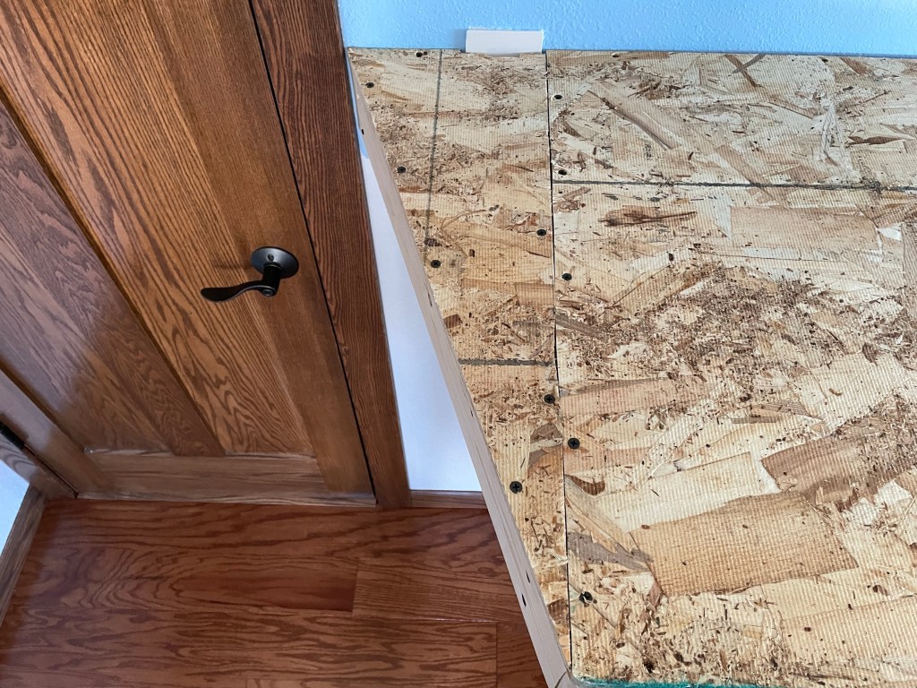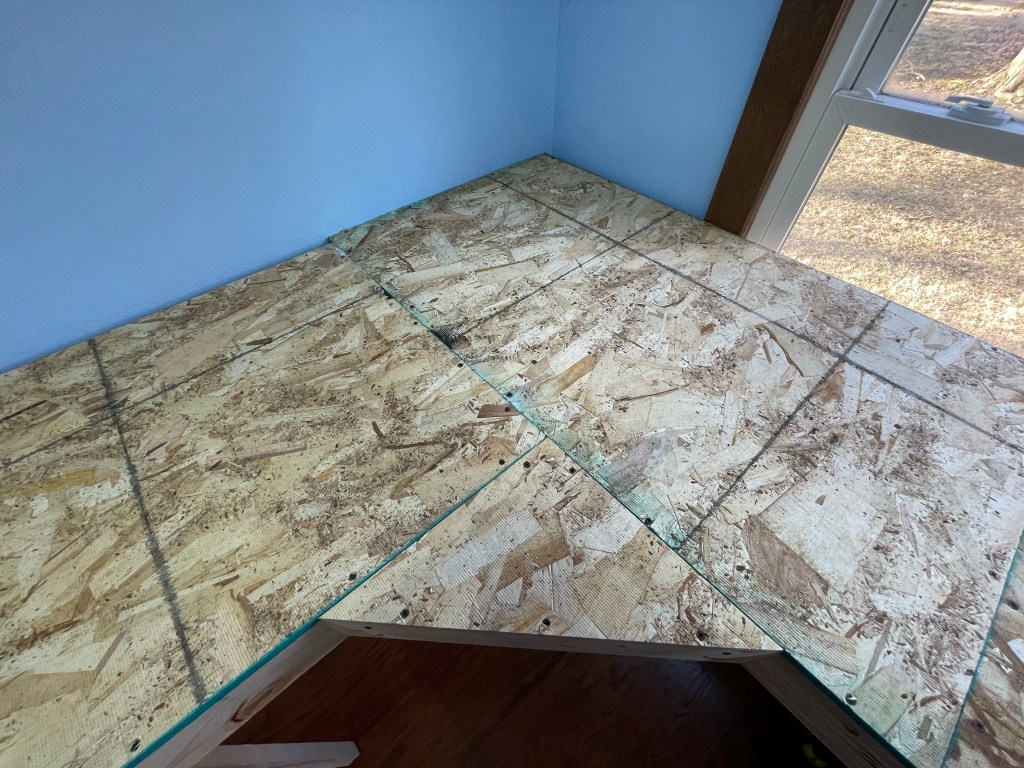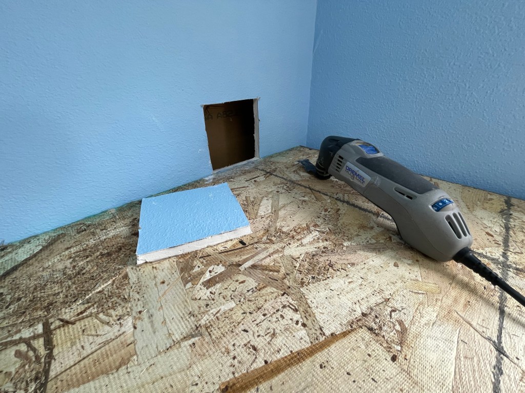 I then cut the hole into the south wall for the track to connect the two rooms. My oscillating tool made cutting the hole a breeze. I’ll finish the opening with a floor of OSB and sides and top of tempered hardboard. All the pieces will probably just be hot glued in place.