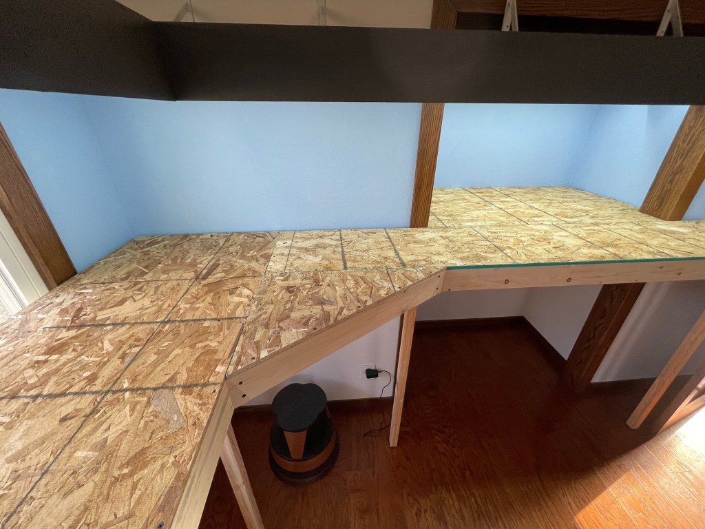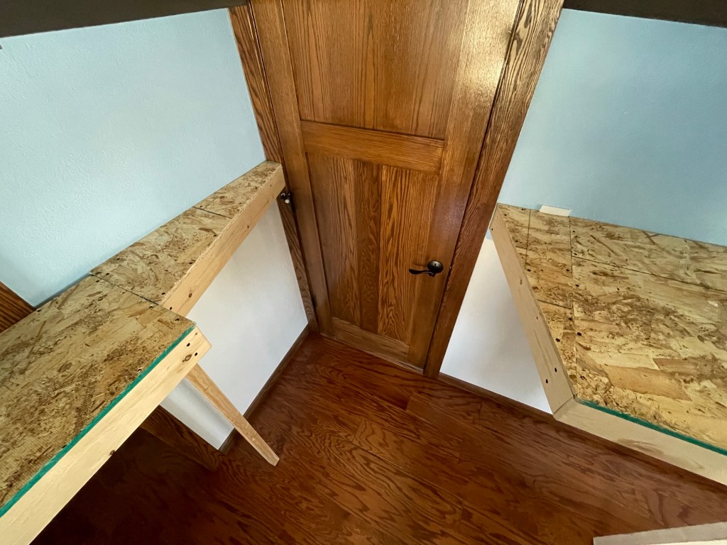 I finished up the benchwork by installing four triangles of OSB at the three corners of the benchwork and at the east end of the south wall by the light switch. These triangles will give me a little more room for track curves at the corners and extend the tracks slightly along the south wall.