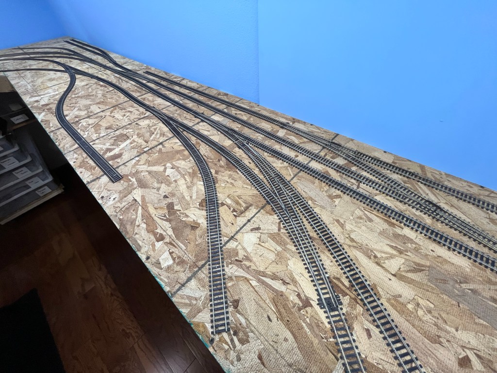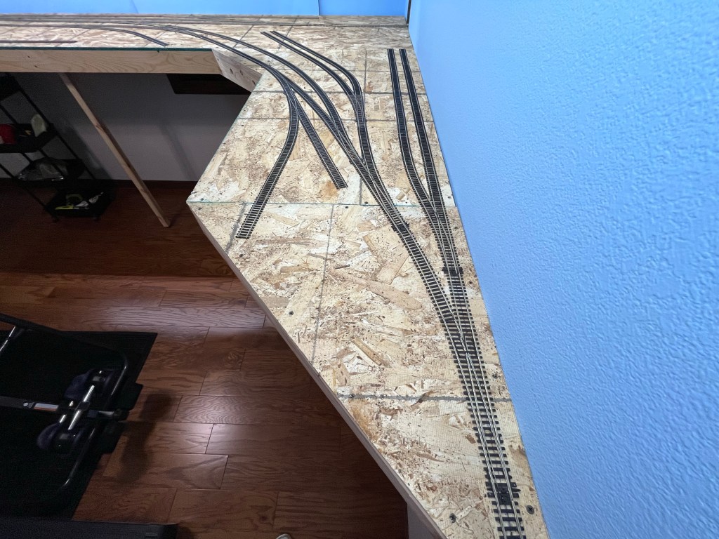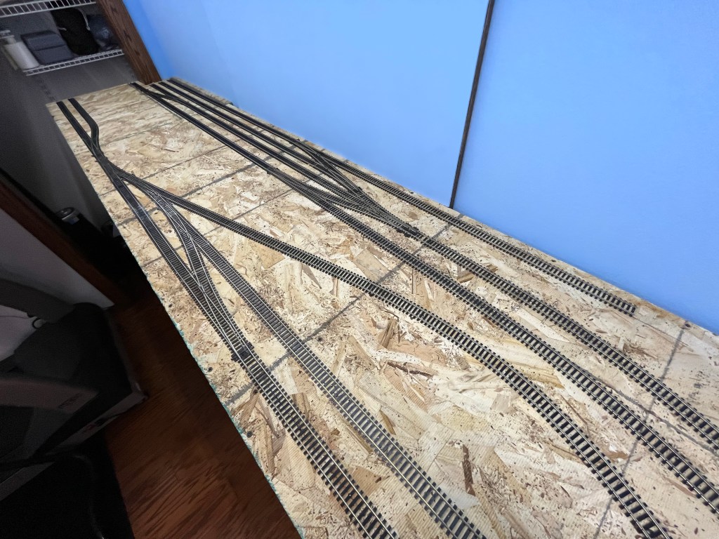 After another detour to install our new induction range and the wiring for it where the propane range was, I’ve progressed on the trackage in Illinois (the south bedroom). The last of the feeders were wired in and the track tested. Everything ran well with no dead sections. I then filled in all the missing ties that were removed to make soldering the feeders easier.