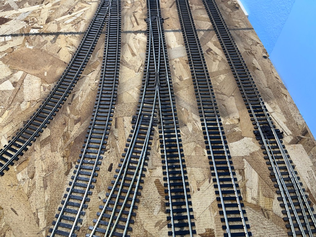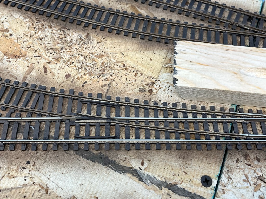 The wood block scrap I used to scrape the track. The diverging leg of the turnout hasn’t been scraped.