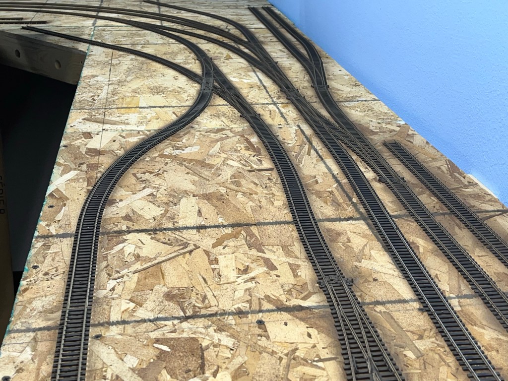 Now that the track laying is done, I’ve begun to paint the track. The ties of the flex track and turnouts are a shiny black and the rail is shiny on the sides, not realistic. I broke out the Paasche airbrush and used some thinned flat latex enamel wall paint and went to town. Years ago, Dom and I would use Floquil rail brown paint to color the track. The Floquil was expensive, hard to clean up and very odiferous. The paint I used today is odor free, cleans up with water and was FREE! Let me explain, 10 years ago, Ace Hardware had an offer to get a free quart sized sample of their new paint. I took some of the Floquil rail brown, painted a swatch on a card and then color matched the swatch to the sample. On the CWI, I painted a little bit of the lower level mainline with this paint.