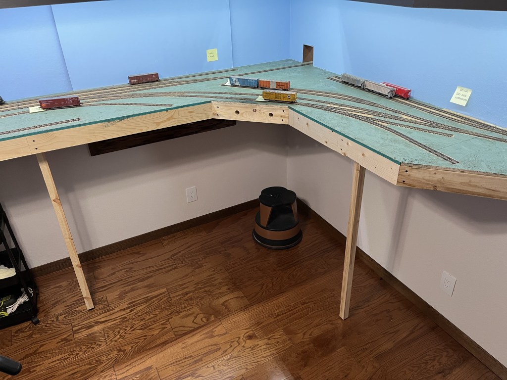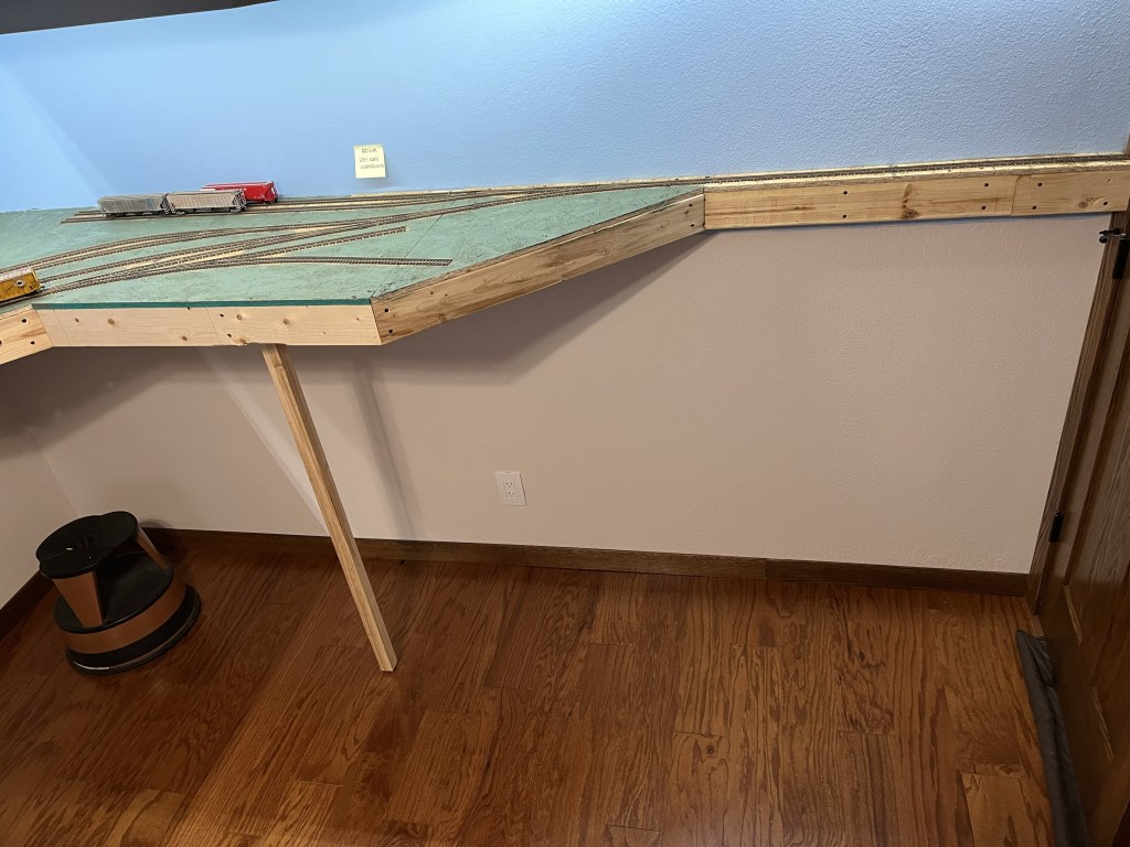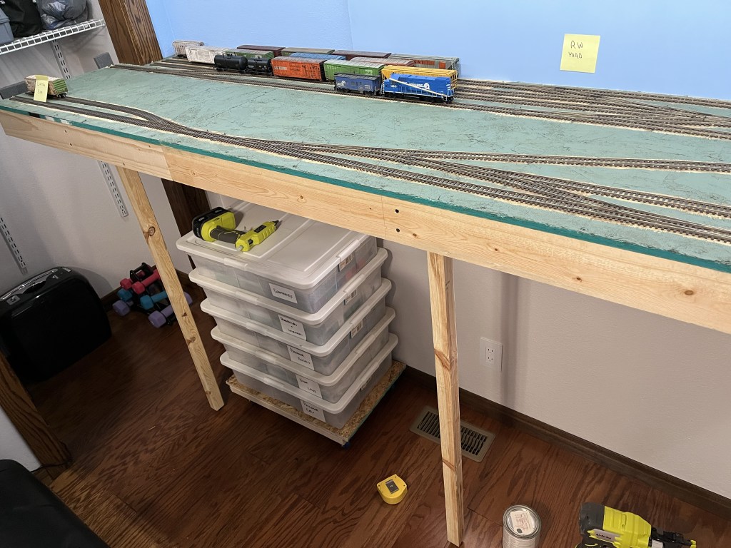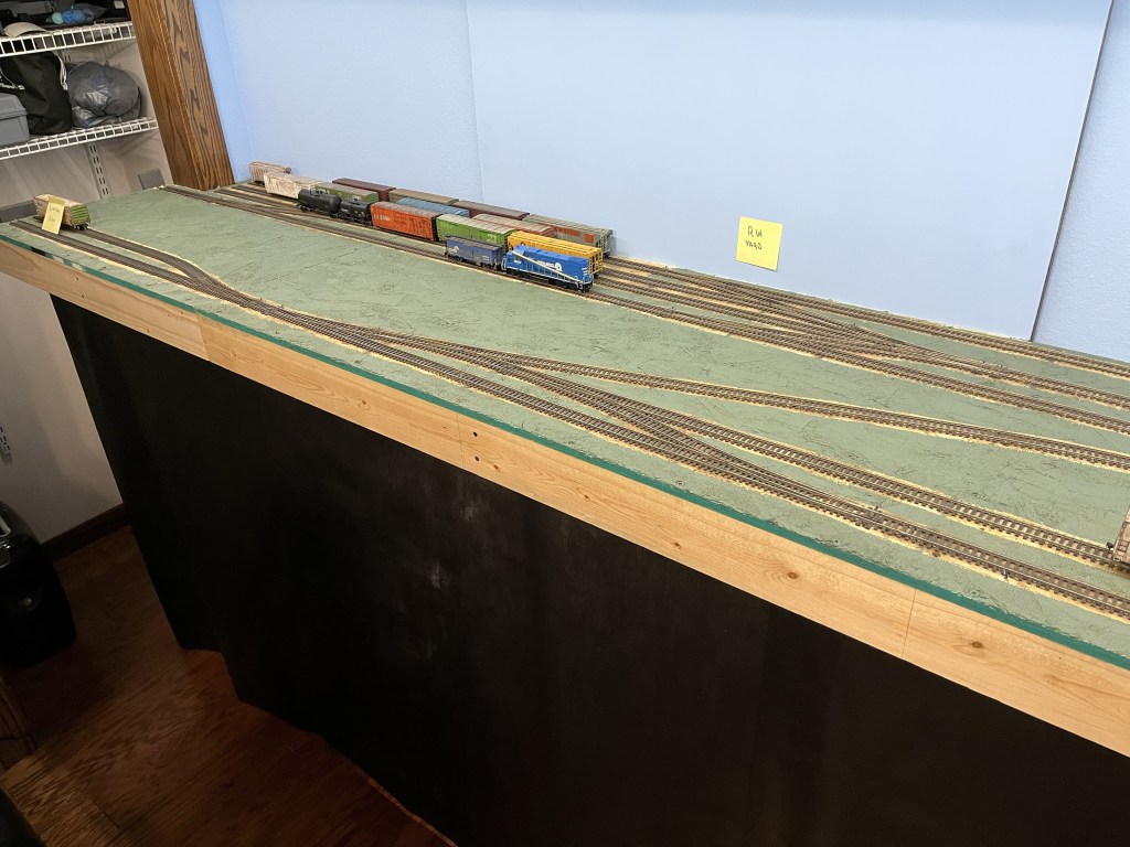 As you can also see, I painted the bare OSB green to help the railroad look a little better. If I had been smart, I would’ve painted the OSB BEFORE I put the track down!