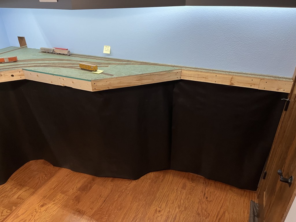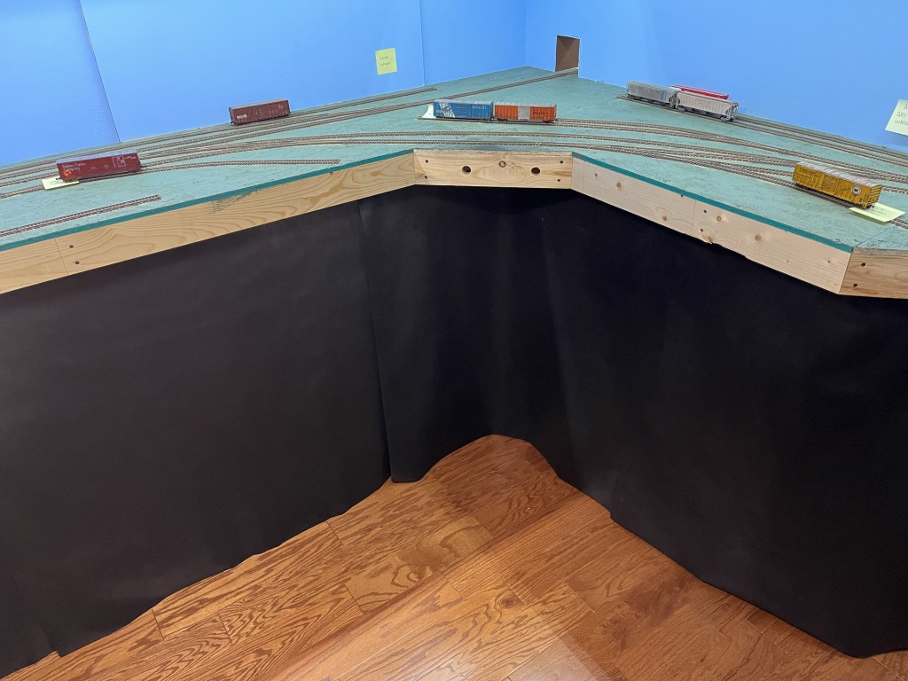 This week, Jen helped me install the skirting around the railroad. The skirting is basic landscape fabric cut to length so that it doesn’t touch the floor and stapled to 1” square wood stock. I used the same material on the old CWI and it worked quite well. The skirting is complete in Illinois and Indiana.