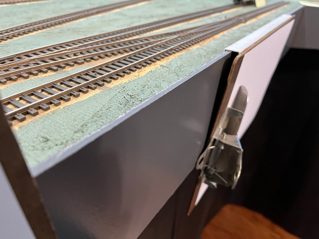 This accomplishes a number of things. First, it simplifies (at least for me) how to terminate the scenery at the benchwork edge. Second, it helps keep rolling stock from falling off the railroad. Third, it gives me a raised edge to hang modified clipboards on. And forth, the raised edge hopefully will help keep forearms off the railroad. As I was test switching cars a couple of weeks ago, I found myself resting my forearms on the railroad.