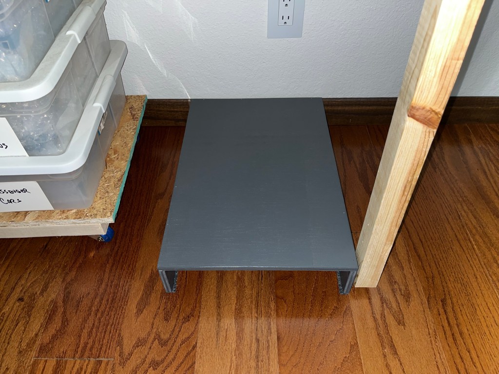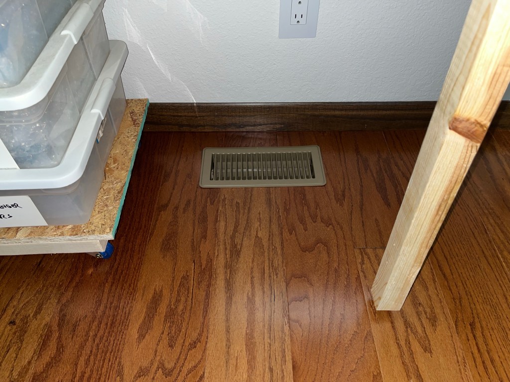 The third wood project completed last week was the building of tunnels for the supply HVAC. The supply registers for the 2 rooms are in the floor. With the skirting installed, the registers are behind the skirting. I built a couple of simple tunnels to direct the forced air outlet to the front of the skirting.