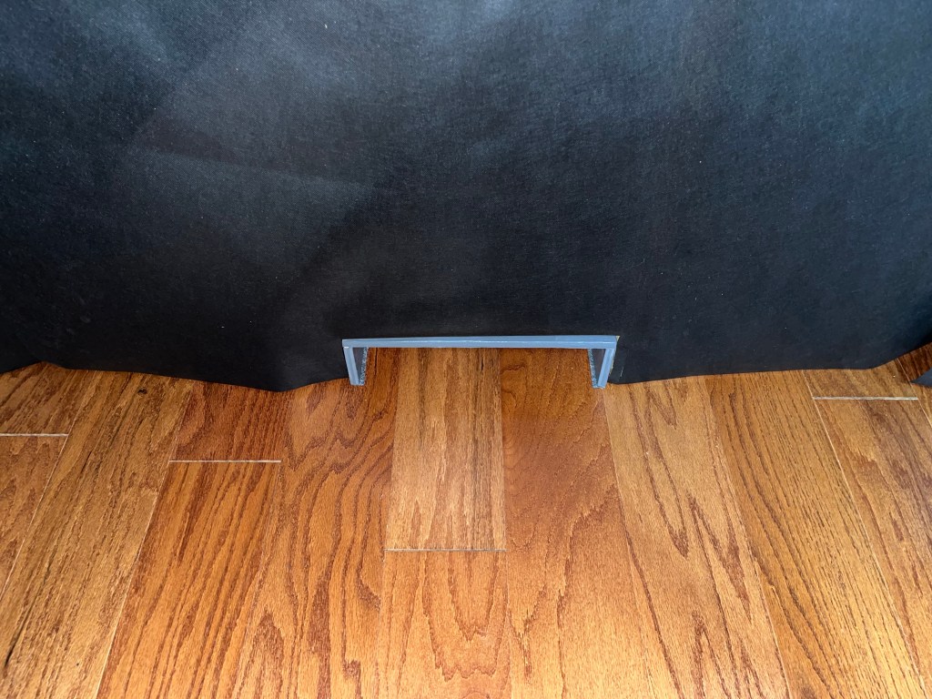 The tunnels are simply 1/2” plywood painted the fascia/valance gray and they just sit on the floor. The tunnels are set back 3-1/2” from the benchwork front so they shouldn’t be impacted by the operators. Felt weatherstripping is fastened to the wood that sits on the floor. If the tunnels aren’t needed, I’ll just pulled them out and the skirting folds down over the opening.