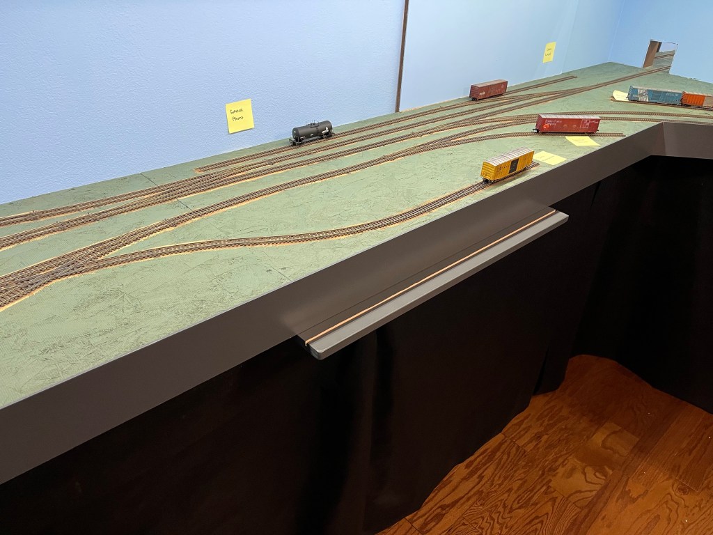 The shelf is simply a piece of 1×4 with a clipboard slot cut into it. I rounded all the visible edges, primed then painted it the same gray as the fascia. They are installed on the long straight sections of the benchwork.